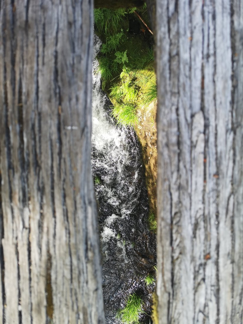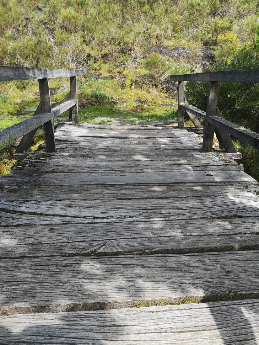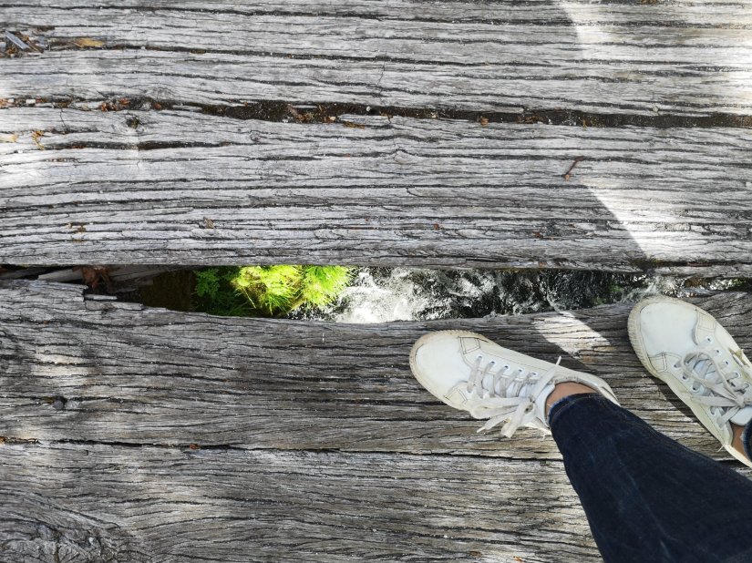 A madeira desgastada de algumas tábuas da ponte, provocou alguns buracos a partir dos quais se pode ver a água a correr por baixo dos nossos pés.