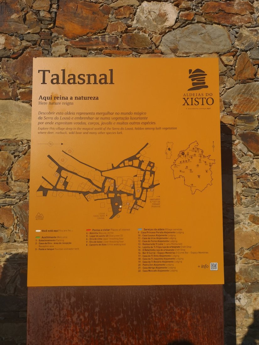 Percebe-se logo o porquê de Talasnal ser a localidade deste conjunto das Aldeias do Xisto, com maior carisma. Pois tem uma disposição, muito particular, na Serra da Lousã e tem uns belíssimos pormenores.As viaturas conseguem descer até a um pequeno largo, à entrada da aldeia, onde é possível inverter a marcha. É aconselhável estacionar o carro, junto à estrada, onde existir um lugar, pois geralmente está muito movimentado.Um pequeno miradouro, logo à entrada da aldeia, junto à Casa da Eira, permite ter umas vistas espetaculares sobre a serra à volta de Talasnal.