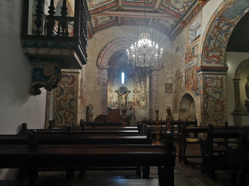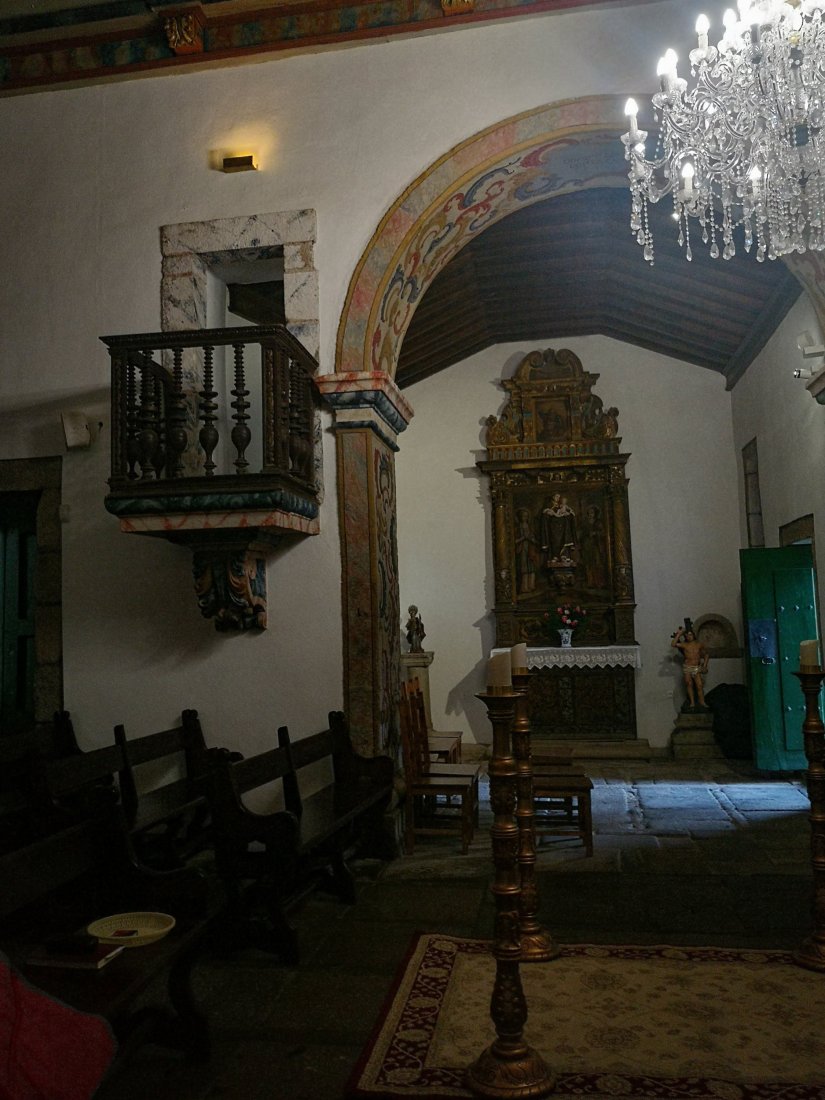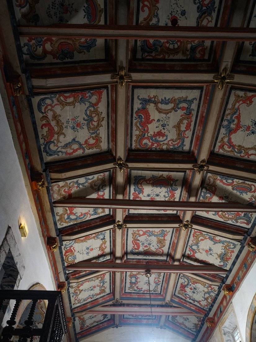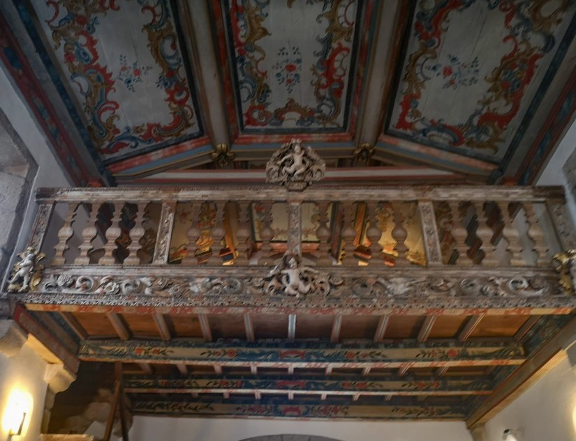 O teto é de caixotões pintados que combinam com belos pormenores de madeira e nas paredes destacam-se pinturas setecentistas.