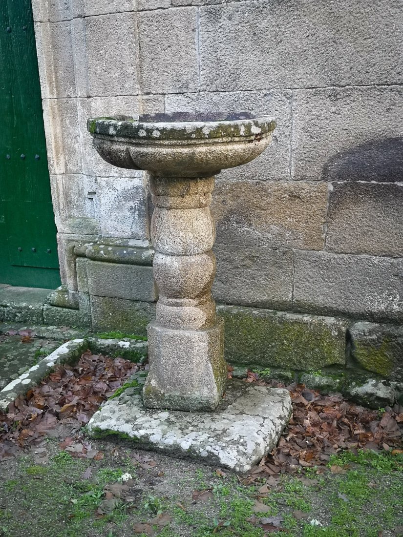 Numa das entradas laterais, pode-se observar a pia de água benta, que se encontra num bom estado de conservação.