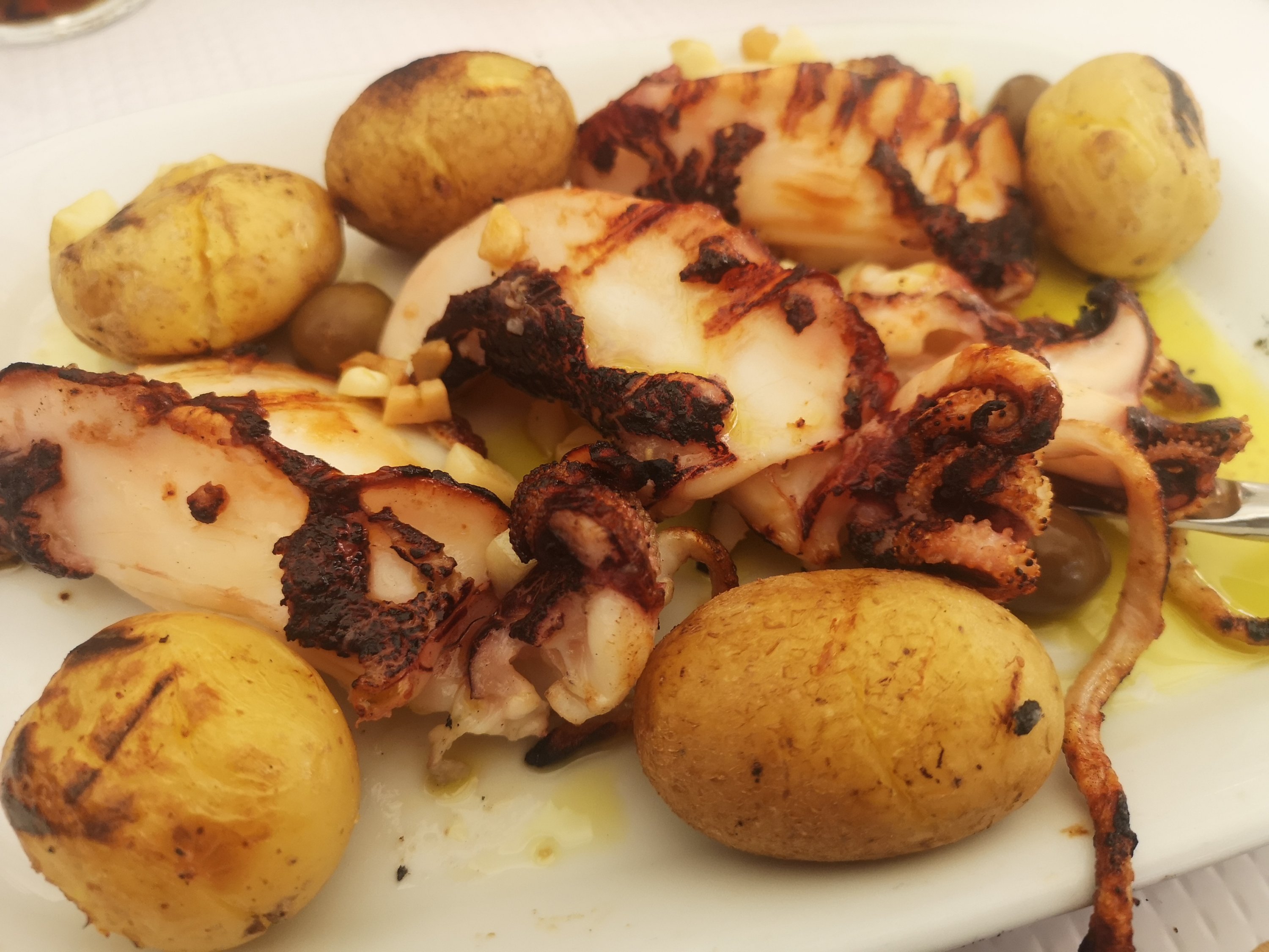 Acabei já tarde a visita ao museu, pelo que fui almoçar. Queria aproveitar este sol, tão agradável em Fevereiro, e comer numa das esplanadas que por ali existem, todas seguidas na rua. Não foi fácil, arranjar mesa, mas lá se conseguiu. Não hesitei, na escolha da comida, pois tinha várias opções de peixes e carnes grelhadas, de que tanto gosto, escolhendo uns chocos à lagareiro com batata a murro, que, não sei se por estar a almoçar ao ar livre, me deliciaram.