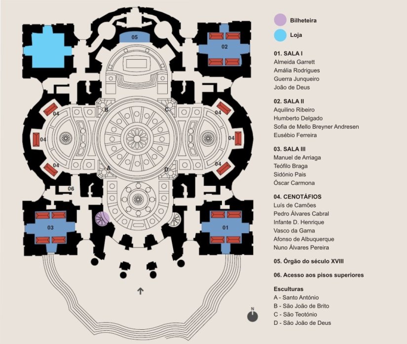 Existem 3 salas tumulares. A primeira acolhe os túmulos de Almeida Garrett, Guerra Junqueiro, João de Deus e Amália Rodrigues.
