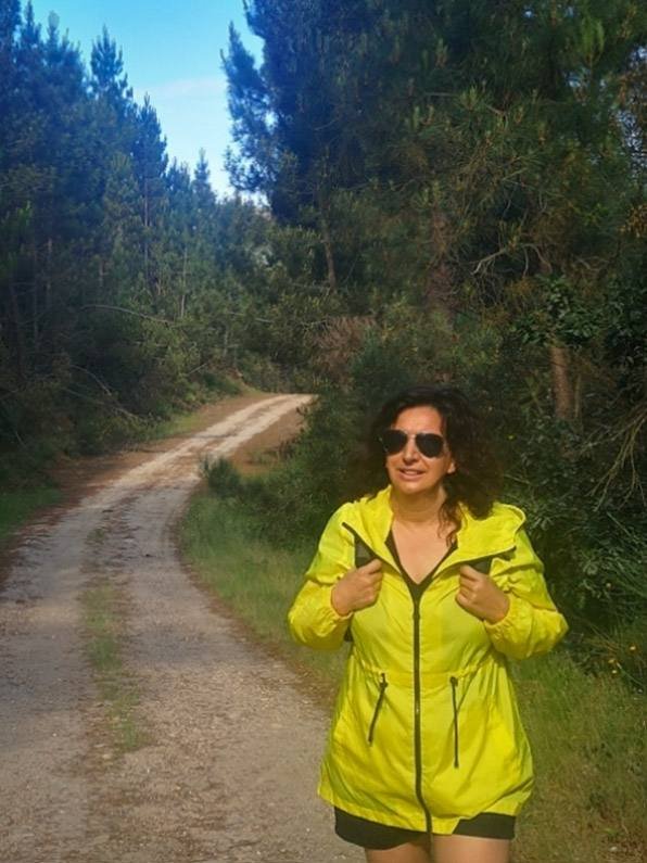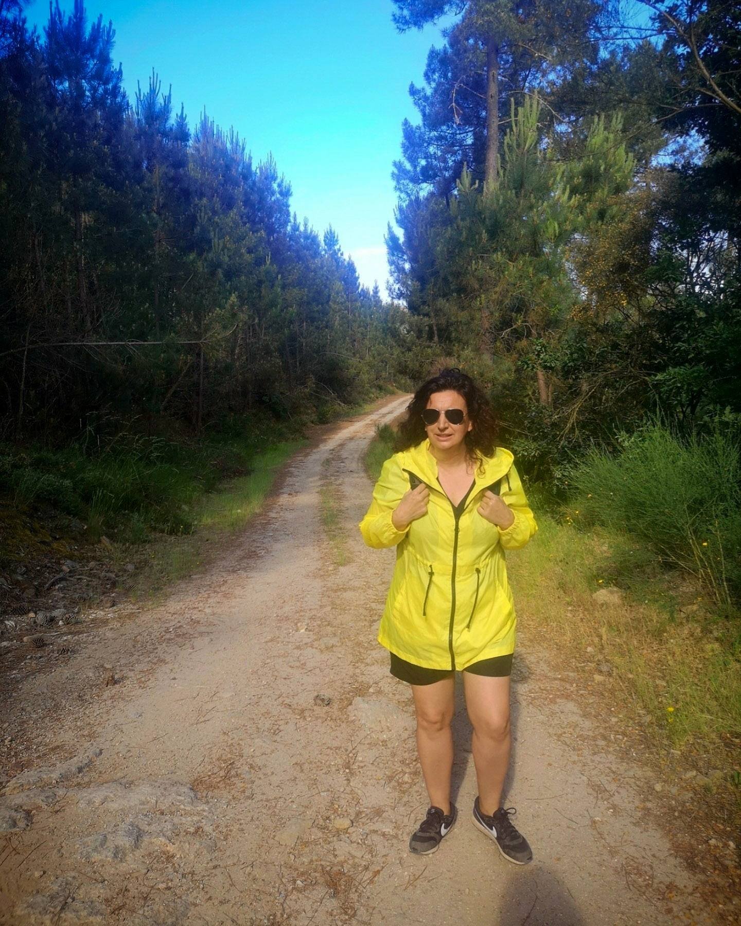 A primeira parte desta caminhada pelo estradão faz-se pelo meio das árvores, nomeadamente pinheiros.