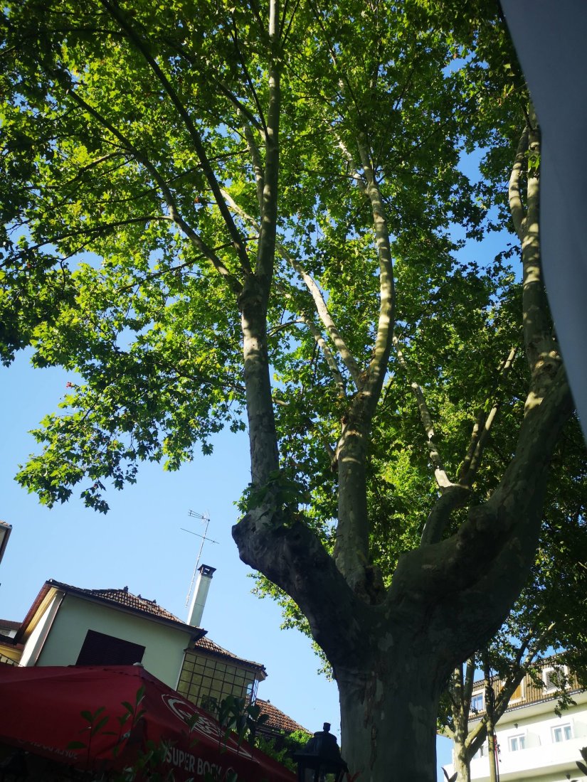 Escolhemos uma mesa da enorme esplanada que o restaurante tem, mesmo por baixo duma árvore tão grande, que proporciona, a toda essa zona, sombra e frescura.