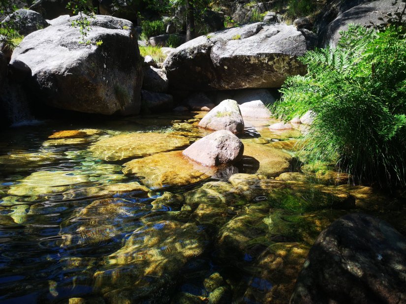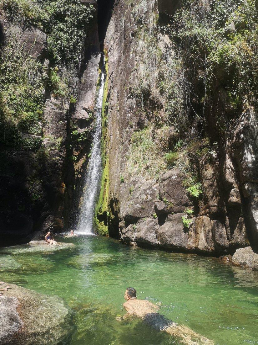 Uma enorme queda de água por entre as rochas que termina numa piscina natural que convida a mergulhar nas suas águas cristalinas. Lá haverá coisa mais bela!