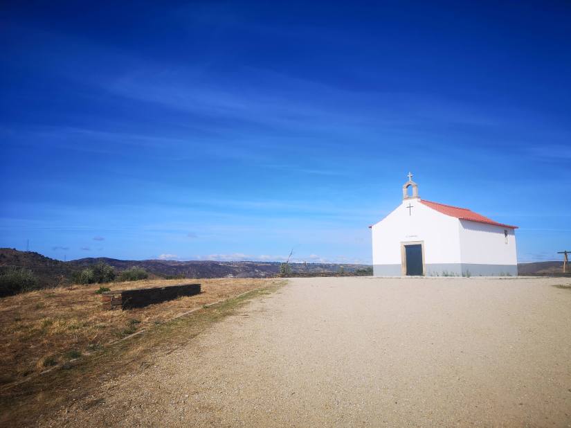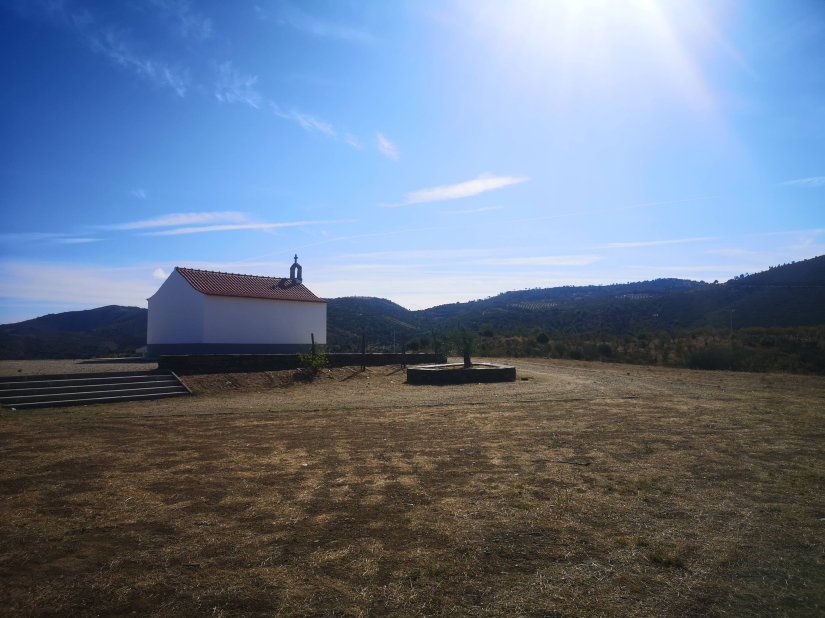 A Capela destaca-se ao longe, não só pelo facto de estar caiada de branco, mas também, por estar totalmente isolada no meio de todo aquele espaço.