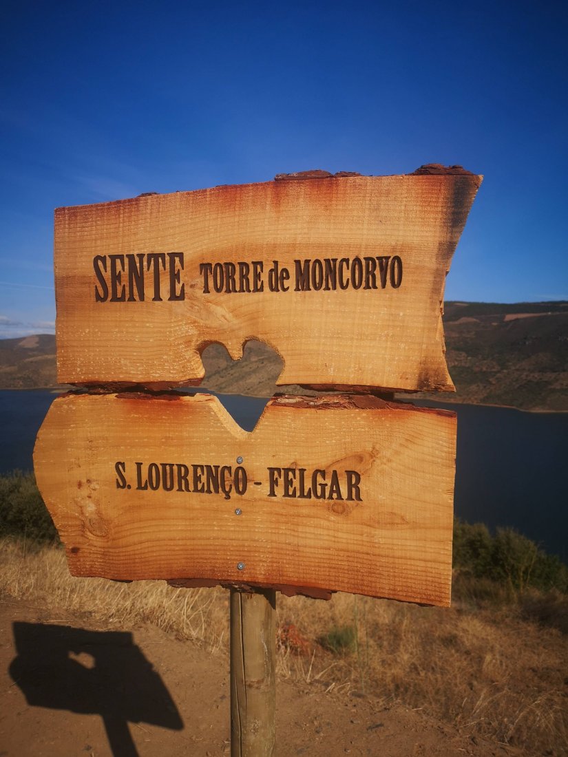 Uma sinalética de madeira junto ao baloiço, recorda a localização e como é bom sentir Torre de Moncorvo.