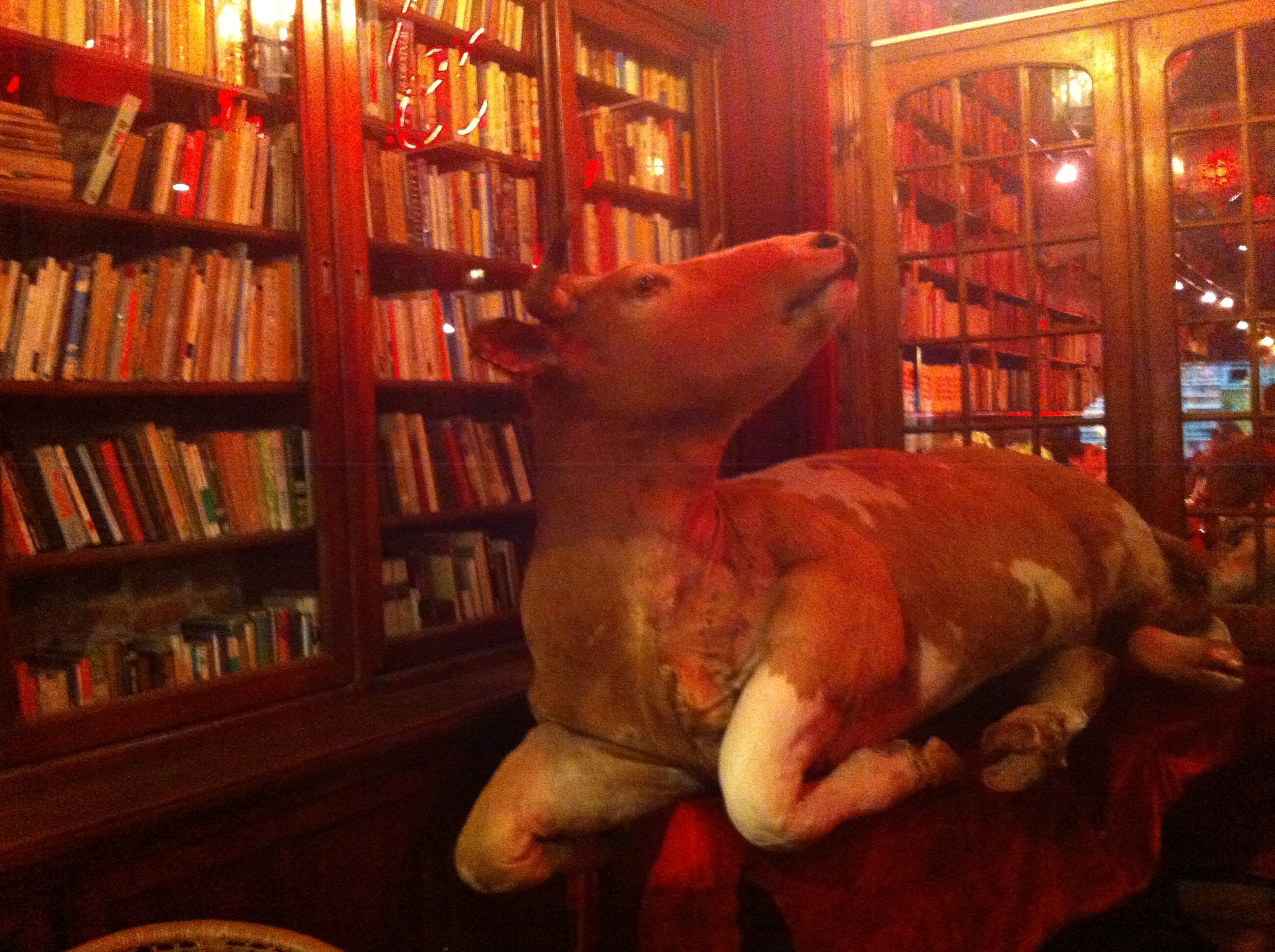Logo na entrada, percebemos o quanto o ambiente deve ser creativo e descontraído, pois tem uma iluminação toda em tons de vermelho e uma enorme vaca, pertencente à decoração, dá as boas vindas a todos.