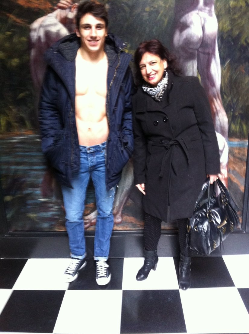 À entrada, um jovem modelo, convida os clientes, para uma fotografia com ele, tendo como pano de fundo pinturas, que são a imagem da loja.