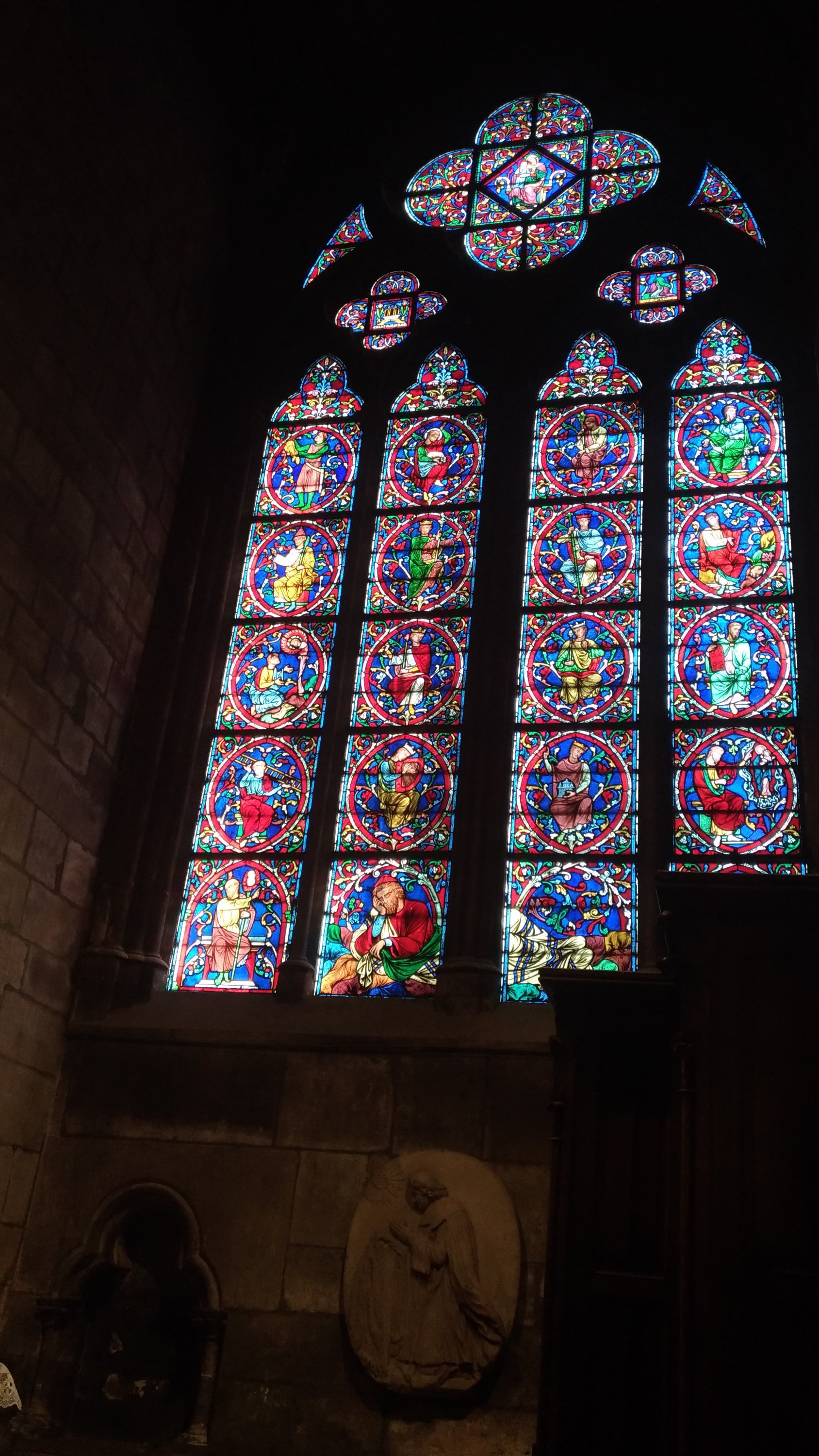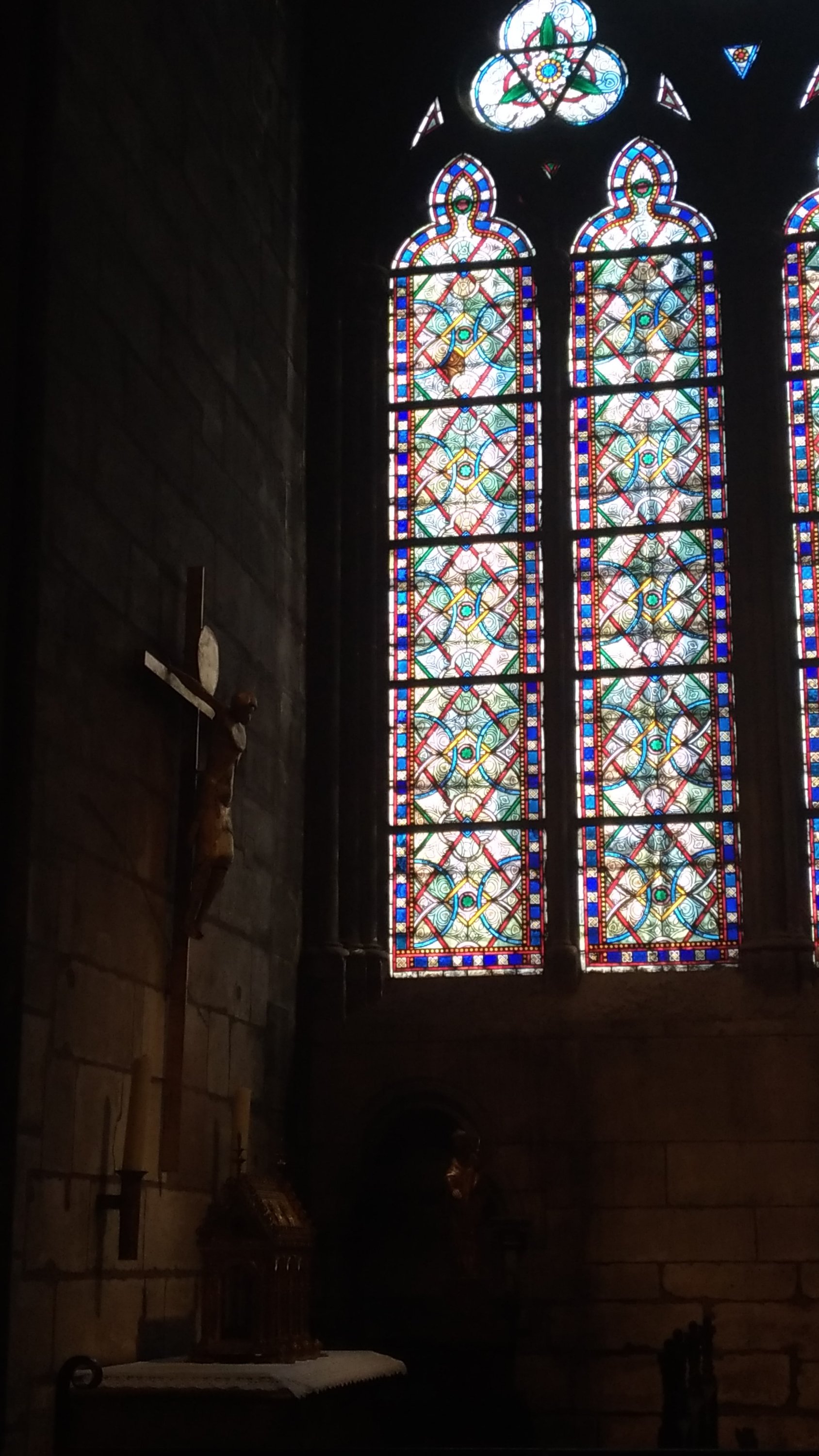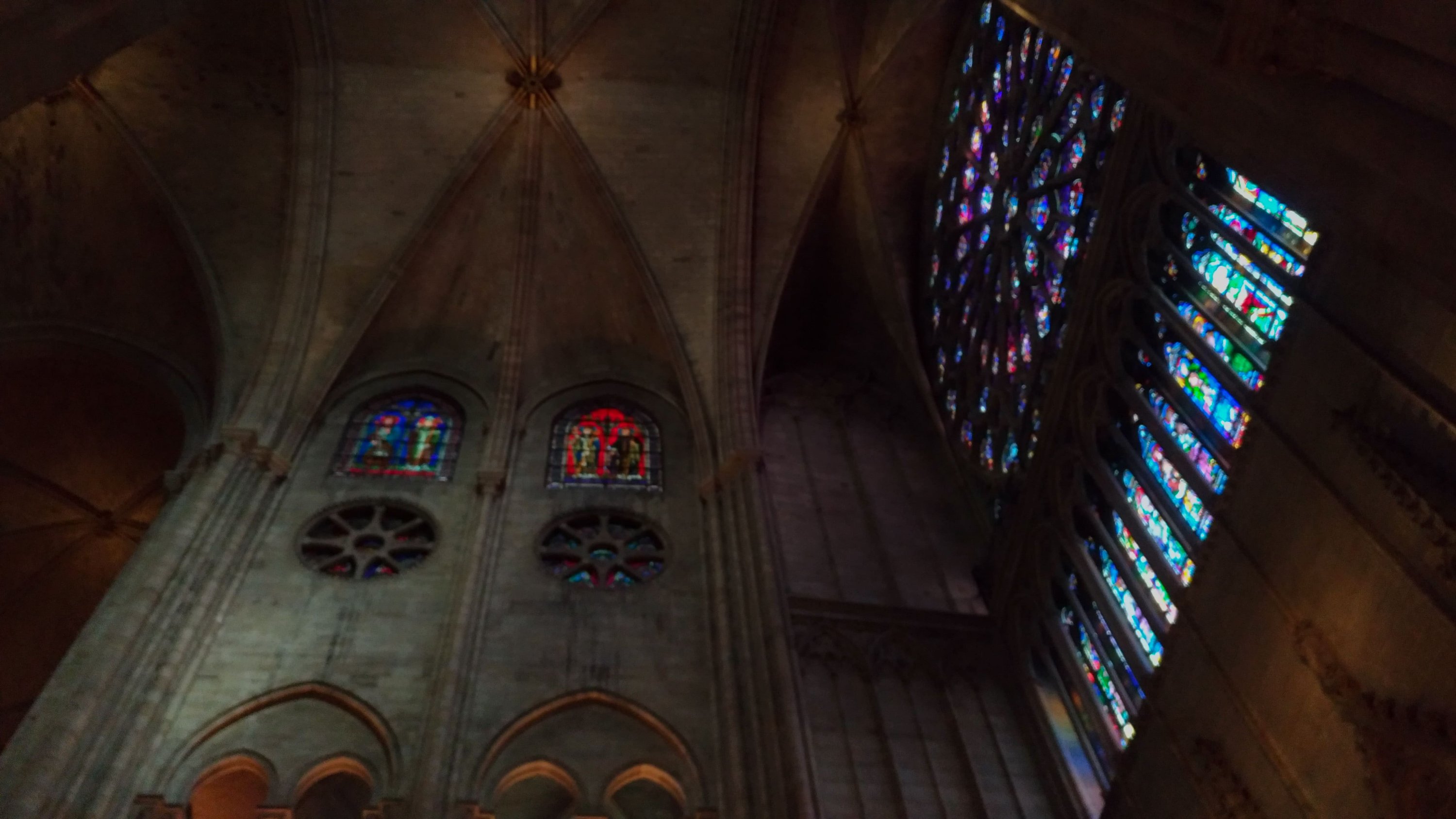 A única fonte de cor é mesmo a dos numerosos vitrais e das suas três famosas rosáceas.