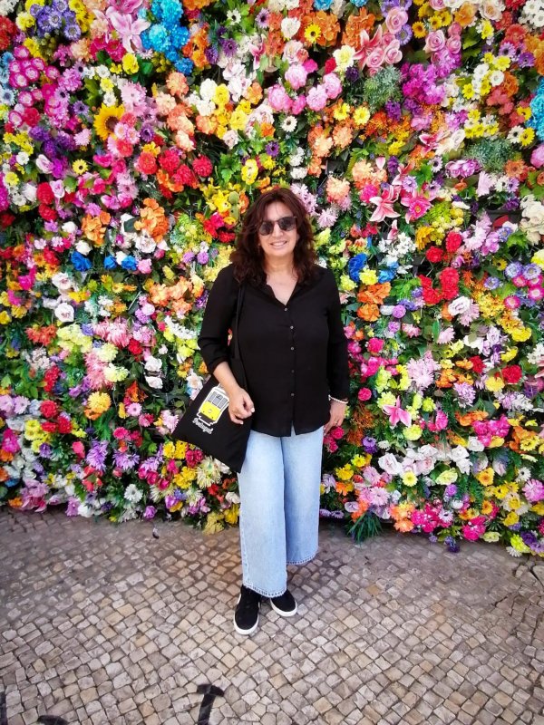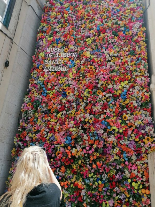 Um mural de flores, junto à porta do museu, é um dos locais onde os visitantes aproveitam para tirar fotografias neste largo.