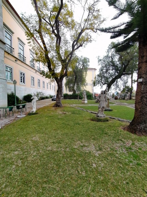 Um jardim, de dimensões consideráveis, permite, justamente, esta ligação entre os edifícios e o Tejo.