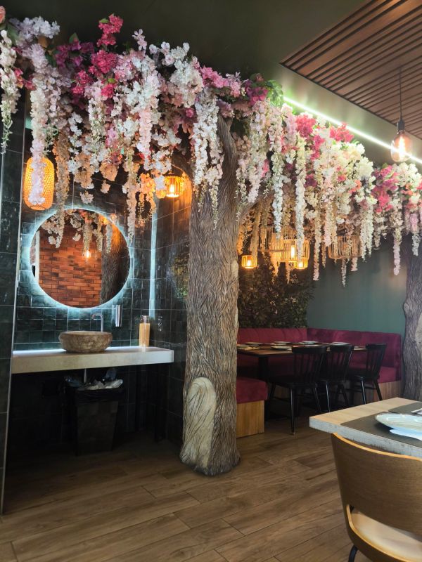 Flores, cor e várias referências à natureza, nomeadamente à floresta, marcavam o espaço.